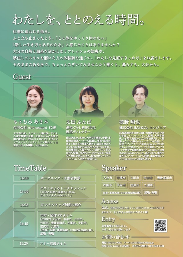 大分の自然と温泉を活かしたリフレッシュの知恵や、移住してスキルを磨いた方の体験談を通じて、「わたしを見直すきっかけ」をお届けします。